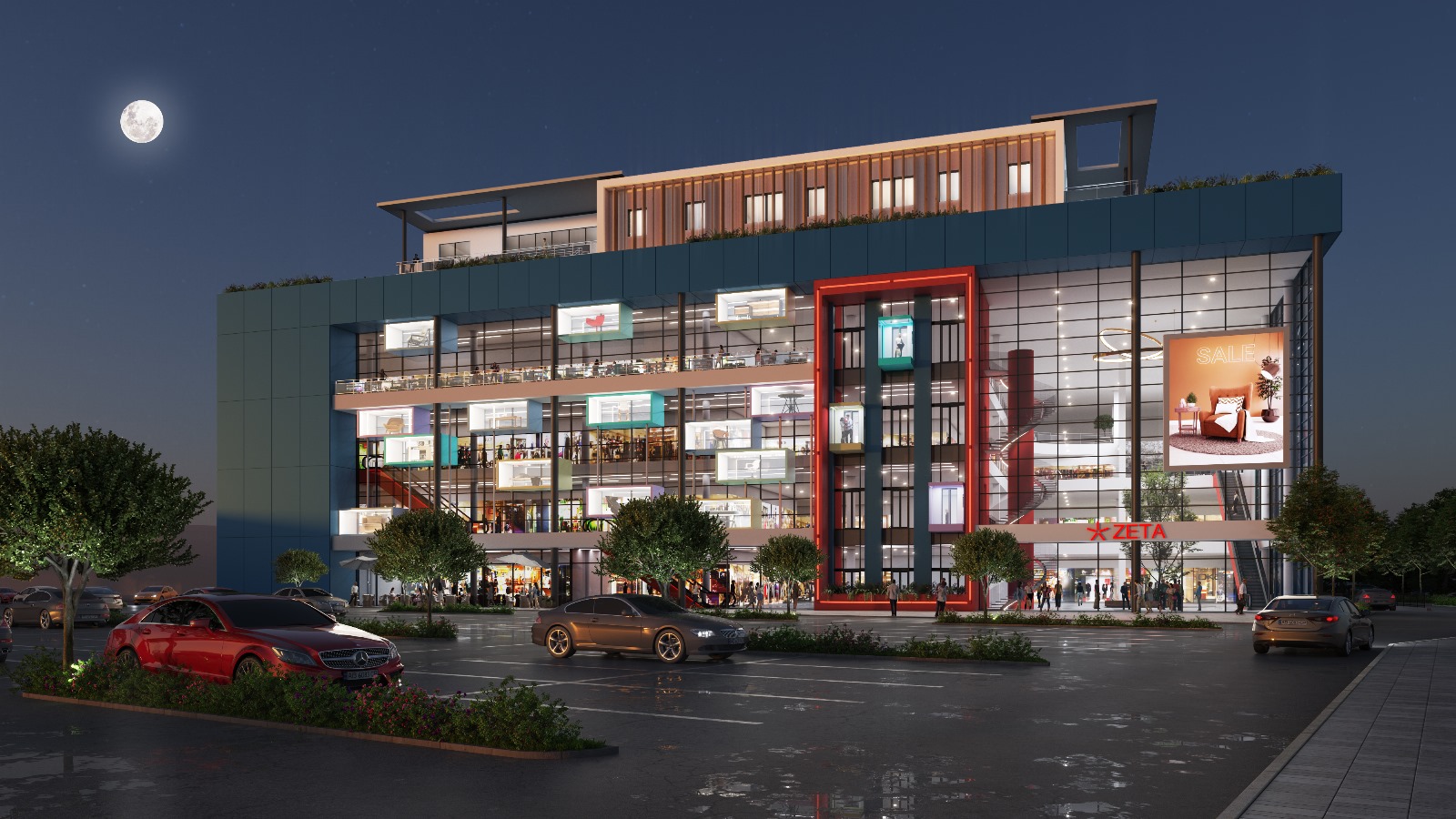 Zeta Mall is the flagship retail and brand center of Zeta — a dynamic destination that integrates retail, public space, and contemporary work environments across a total area of 19,500 sq.m. Strategically located on Rayimbek Avenue, along Almaty's ring road, the site offers excellent citywide access and visibility, positioning Zeta Mall as both a commercial hub and an architectural landmark. Zeta Mall is a journey-based retail environment that combines shopping, leisure, office space, and architectural spectacle. From its intuitive vertical circulation and thematic zoning, to public programming areas and cafes that encourage return visits, every element is designed to support Zeta’s mission: to be more than a store — to become a destination. Design Vision The building features a transparent multi-layered façade. A standout feature of the main façade is a series of colorful display boxes, each showcasing large-scale sample furniture pieces produced by Zeta. These volumetric showcases act as both brand icons and architectural signage, transforming the façade into a living advertisement that animates the street and draws attention from afar.